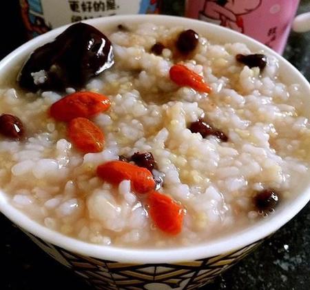 大米洗净浸泡半个小时后和煎出来的汤混合,再加入足量的水熬成米粥即可。
