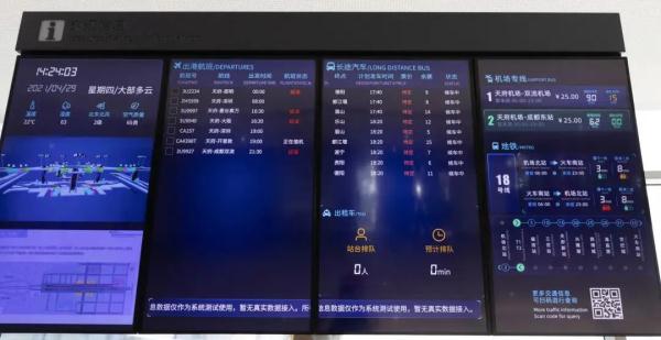 97块屏幕实时显示出港航班信息,长途汽车、机场专线票务信息,地铁乘车信息,等候出租车旅客排队情况及等待时间,以便你选择最合适、最高效的交通方式。