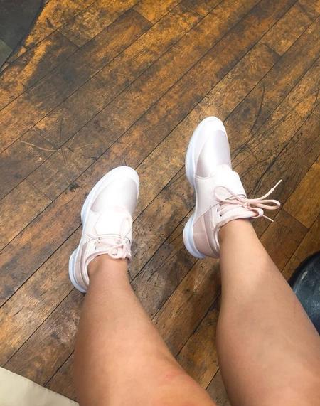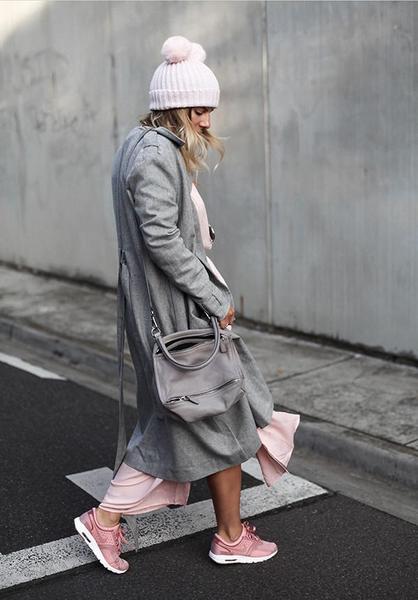 粉红色运动鞋无论季节都很好搭,特别是这两年疯狂流行脏粉色,无论是和灰色对比配,还是自上而下全套脏粉色,都很夺人眼球。