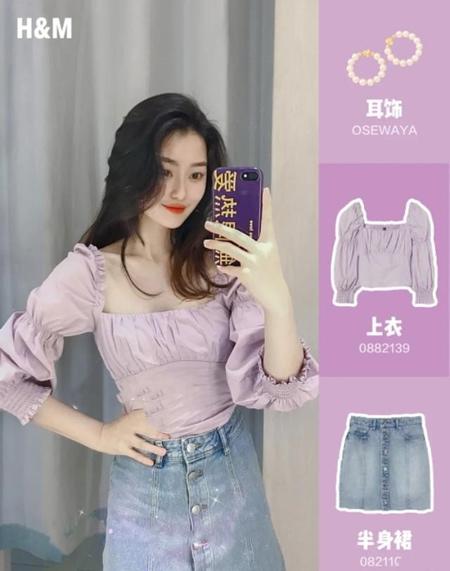 今年这种特别柔和的马卡龙色系真的很流行,像优衣库,zara灯都出了同颜色得单品,而HM的这件宫廷风得小上衣真的很好看,特别有女人味并且很显身材,下面搭配一件基础牛仔裙就很吸睛了。