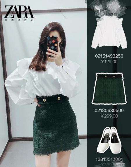 上衣有点夸张设计的白衬衫与宝石绿色有点小香风短裙得搭配,又时尚又优雅。
