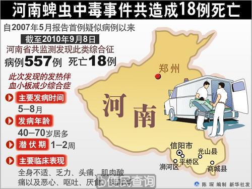 河南省自2007年5月信阳市报告了首例疑似无形体病例以来,通过全省进一步排查和监测,有关该事件的最新统计数据是:截至2010年9月8日,河南省共监测发现此类综合征病例557例,死亡18例,重点集中在信阳市商城县、浉河区、光山县和平桥区。