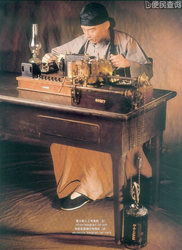 桌子上放着的是莫尔斯人工电报机(偏左的那一个)和韦斯登重锤式电报机。