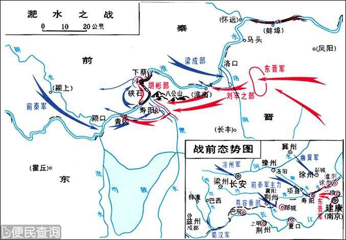 淝水之战,又称肥水之战,发生于东晋太元八年(前秦建元十九年)(383年),前秦出兵伐晋,于淝水(现今安徽省寿县的东南方)交战,最终东晋仅以八万军力大胜八十余万前秦军。