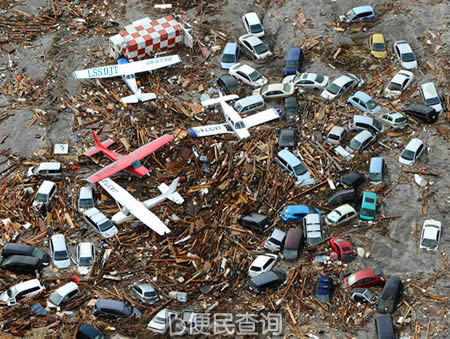 日本仙台,机场里的飞机和汽车被地震引发的海啸冲在一起