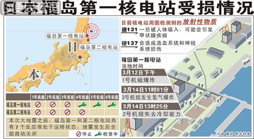3月12日,第一核电站反应堆芯的燃料开始熔化,放射性物质出现泄漏,当天下午,第一核电站发生两次爆炸。