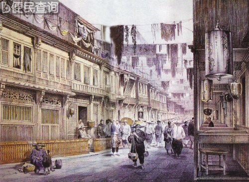 约1840年,广州十三行商馆的同文街,沿街设有售卖各种货物的中国店铺