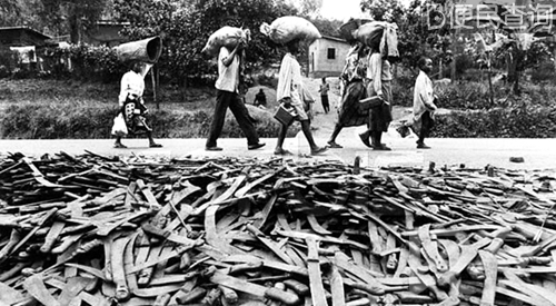 屠杀惨案后,幸存者从政府收缴的砍刀堆放处边上走过