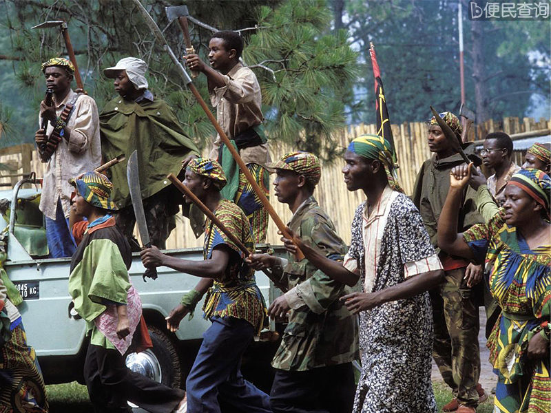 1890年到1918年时卢旺达为德国的殖民地,1918年到1962年为比利时的殖民地。少数民族图西族(约18%)始终统治着占约80%左右人口的胡图族。在比利时人离开后,政权交还给占多数人口的胡图族。在1962年卢旺达独立后,政府也未妥善处理民族之间的对立问题。图为电影截图。