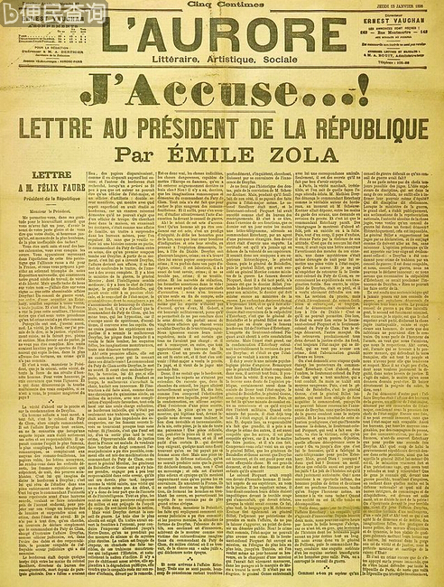 这是法国发生的一桩著名冤案,曾在法国社会引起了轩然大波,著名作家左拉曾经以《我控诉》一篇檄文表达了自己的愤怒。图为《我控诉》原文